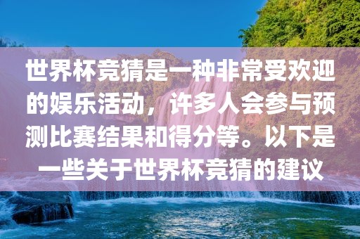 世界杯竞猜是一种非常受欢迎的娱乐活动,许多人会参与预测比赛结果和得分等。以下是一些关于世界杯竞猜的建议