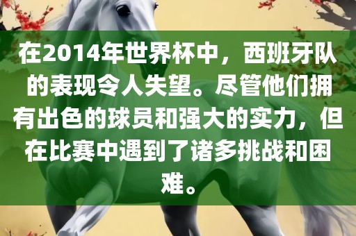 在2014年世界杯中,西班牙队的表现令人失望。尽管他们拥有出色的球员和强大的实力,但在比赛中遇到了诸多挑战和困难。