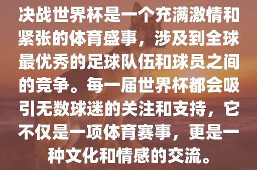 决战世界杯是一个充满激情和紧张的体育盛事,涉及到全球最优秀的足球队伍和球员之间的竞争。每一届世界杯都会吸引无数球迷的关注和支持,它不仅是一项体育赛事,更是一种文化和情感的交流。