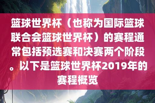 篮球世界杯(也称为国际篮球联合会篮球世界杯)的赛程通常包括预选赛和决赛两个阶段。以下是篮球世界杯2019年的赛程概览