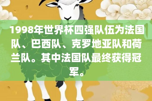 1998年世界杯四强队伍为法国队、巴西队、克罗地亚队和荷兰队。其中法国队最终获得冠军。
