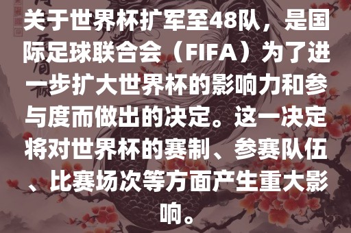 关于世界杯扩军至48队,是国际足球联合会(FIFA)为了进一步扩大世界杯的影响力和参与度而做出的决定。这一决定将对世界杯的赛制、参赛队伍、比赛场次等方面产生重大影响。