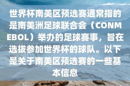 世界杯南美区预选赛通常指的是南美洲足球联合会(CONMEBOL)举办的足球赛事,旨在选拔参加世界杯的球队。以下是关于南美区预选赛的一些基本信息