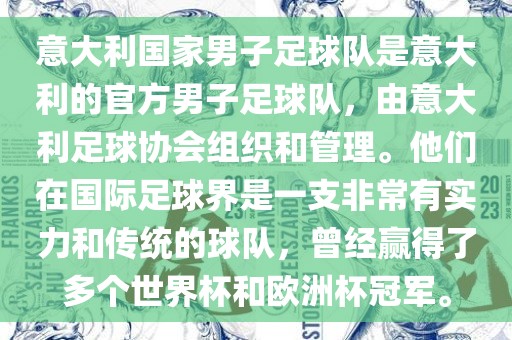 意大利国家男子足球队是意大利的官方男子足球队,由意大利足球协会组织和管理。他们在国际足球界是一支非常有实力和传统的球队,曾经赢得了多个世界杯和欧洲杯冠军。
