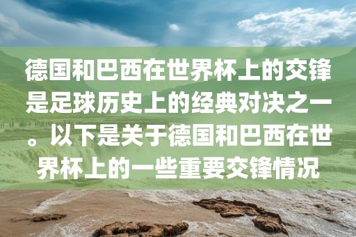 德国和巴西在世界杯上的交锋是足球历史上的经典对决之一。以下是关于德国和巴西在世界杯上的一些重要交锋情况