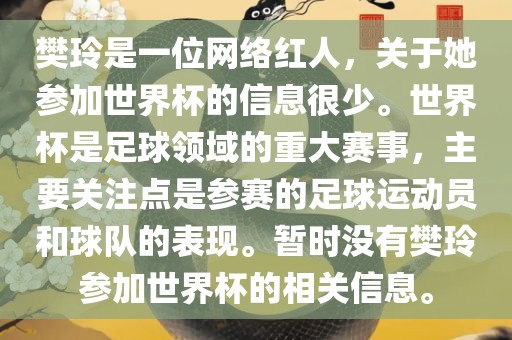 樊玲是一位网络红人,暂无关于她参加世界杯的信息。世界杯是足球领域的重大赛事,关注焦点在于足球运动员和球队的表现。目前未有报道显示樊玲参与这一盛事。摘要字数控制在100-200字以内。