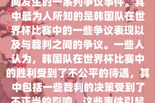关于韩国世界杯的黑哨事件是一个复杂的话题,涉及到许多因素和争议,重要的是要认识到,在没有确凿证据的情况下,不应该轻易地下定论或传播不实信息,我们也应该尊重每个参赛国家和他们的运动员,遵守国际规则和道德准则,确保比赛的公正和公平。