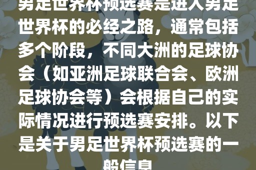 男足世界杯预选赛是进入男足世界杯的必经之路,通常包括多个阶段,不同大洲的足球协会(如亚洲足球联合会、欧洲足球协会等)会根据自己的实际情况进行预选赛安排。以下是关于男足世界杯预选赛的一般信息