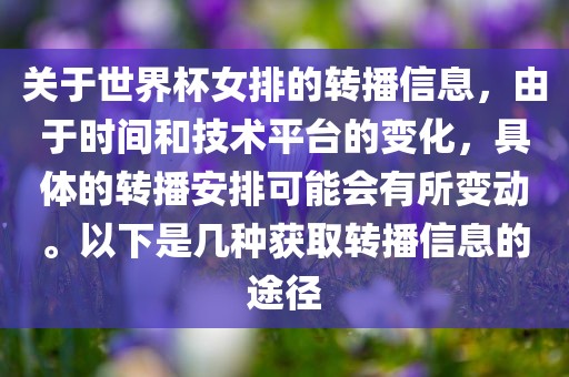 关于世界杯女排的转播信息,由于时间和技术平台的变化,具体的转播安排可能会有所变动。以下是几种获取转播信息的途径