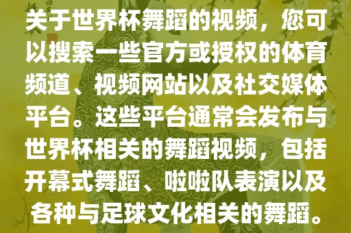 关于世界杯舞蹈的视频,您可以搜索一些官方或授权的体育频道、视频网站以及社交媒体平台。这些平台通常会发布与世界杯相关的舞蹈视频,包括开幕式舞蹈、啦啦队表演以及各种与足球文化相关的舞蹈。
