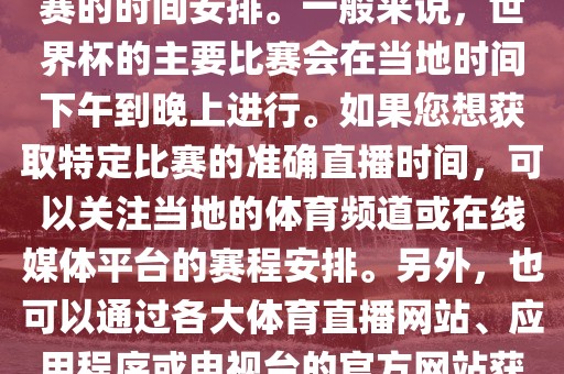 由于时差和版权问题,不是所有比赛都能在所有地区进行直播,建议您关注官方渠道或可靠的新闻来源以获取最新的世界杯直播时间信息。